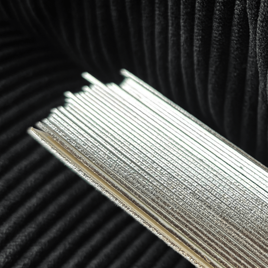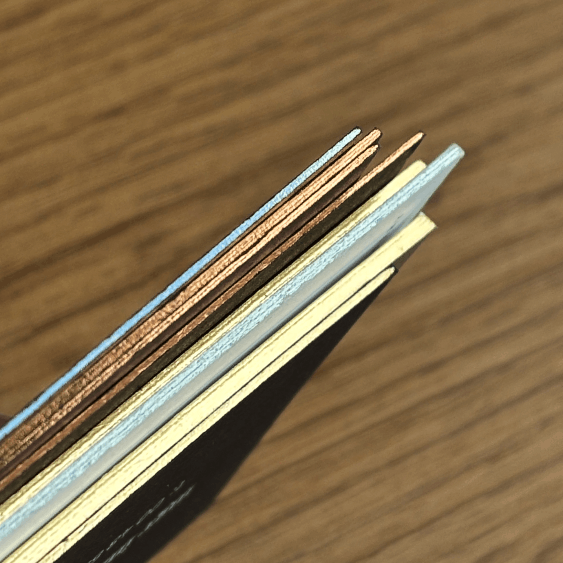 Krawędzie pokryte metaliczną folią subtelnie odbijają światło, tworząc efekt eleganckiego połysku. Powstają po sklejeniu minimum dwóch, maksymalnie czterech warstw papieru, dzięki czemu są grubsze, sztywniejsze i ładnie eksponują folie.